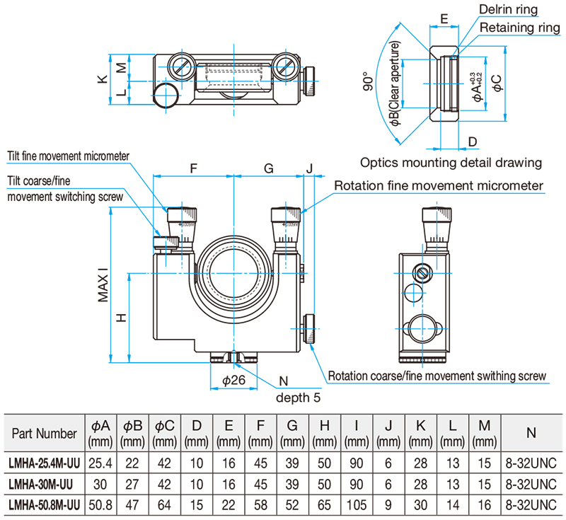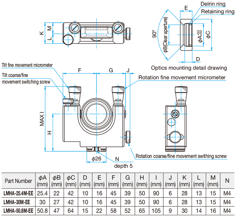 ◦使用螺纹环从镜片反面固定,所以,即使镜片的厚度不同,都能保证反射面的位置在角度调整的中心处。
