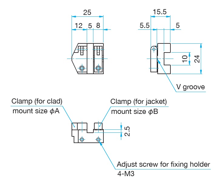 ◦把光纤先端的保护层剥掉15mm程度长度,置于V形槽内后用树脂压块固定。然后,使用旁边的用于加固900μm外径保护层的V形槽和树脂压块固定,保证光纤不动。