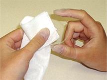 (2) 两脚戴上护指套,用含有酒精的纸擦除粘正在护指套上的污渍。接着,将透镜纸3〜100px严颀长天折叠。