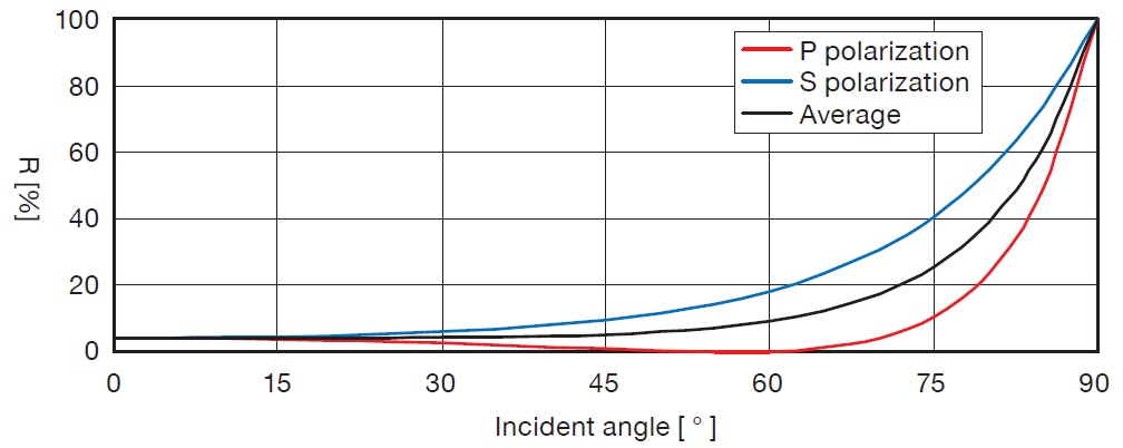 ▶使用激光那样的直线偏光的光源时,反射率随偏光方向在0.9〜9.6%范围内变化。(参照反射率波长特性图)