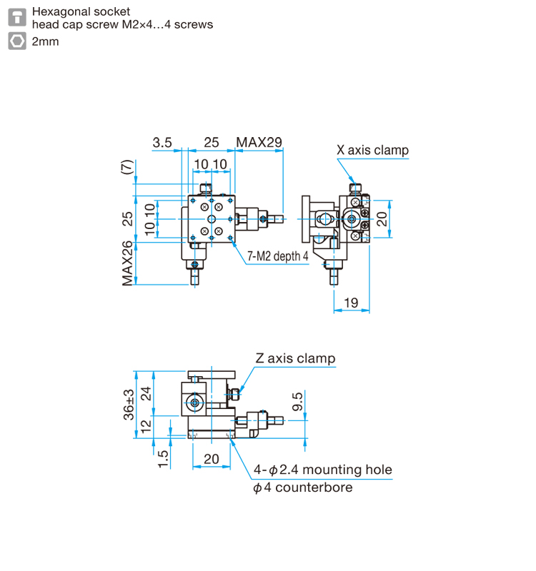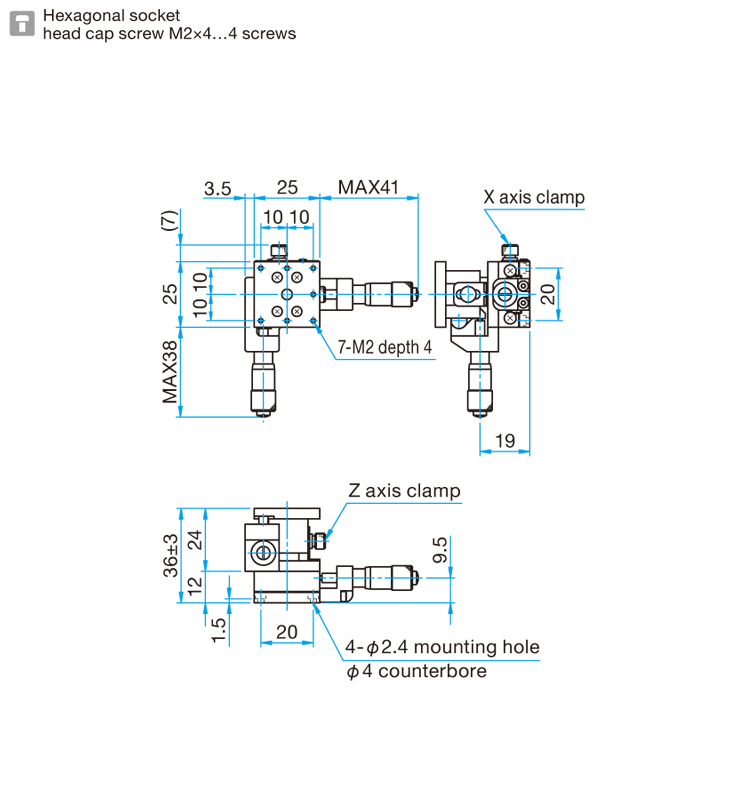 4.型号末尾为FP的产品,采用的是精密调整螺杆,请注意不是一般的微分头。精密调整螺杆的螺距为0.25mm,在操作时请使用六角扳手或另售的六角手轮扳手